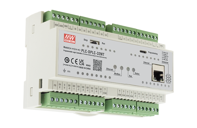Riadiaca jednotka MEAN WELL, napájaná napätím 20,4÷28,8V DC, príkon 15W, 12+4 digitálnych vstupov, 2 analógové vstupy, 12 digitálnych výstupov + 4 výstupu PWM. Zariadenie na DIN lištu. Označenie "M" predstavuje základnú a "E" rozširujúcu jednorku. EMC podĺa IEC61131-2. Programuje sa cez OpenPLC editor, súčasťou je MODBus interfejs.